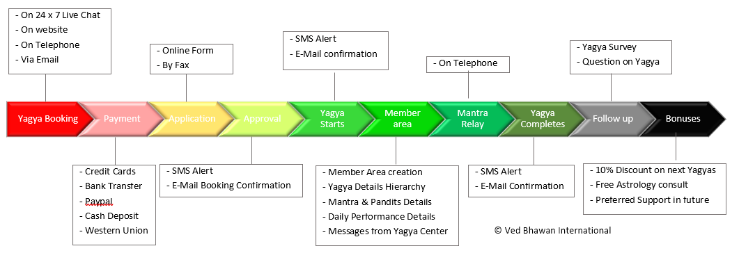 You select one or more yagyas from the Yagya List, those are closest to your desire. You can book them by paying through Credit card / Debit card / Banks in US, Europe, India or Pay Pal. After receipt of Payment your Yagya gets automatically booked. You can change the Yagya at least 1 day before Yagya has been started. Your payment is identified by your email.